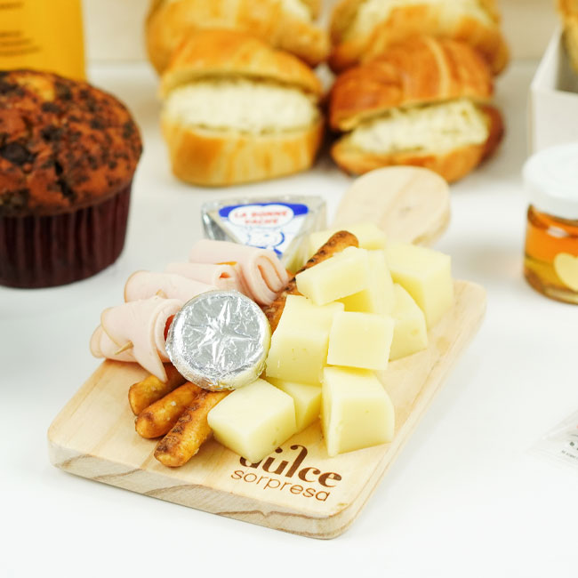 - Tablita de madera Dulce Sorpresa con quesos, jamón, pretzels y un chocolatito de leche La Ibérica