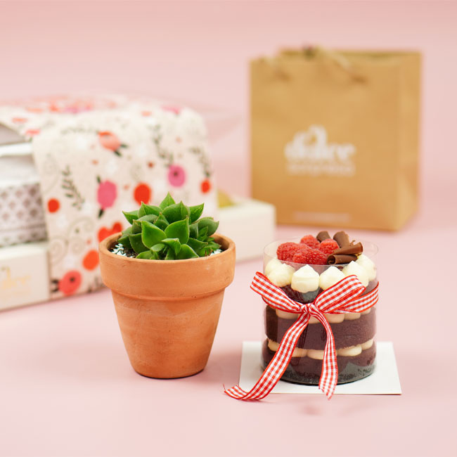 Nuestros dulces no contienen preservantes y son horneados en nuestro taller diariamente para cada pedido. La plantita suculenta viene en una bolsita Dulce Sorpresa fuera de la caja de regalo.