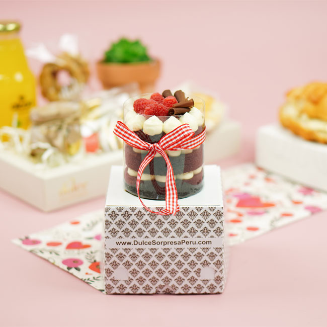 • Tortita personal de chocolate relleno de buttercream suizo, fudge y decoración de fruto rojo.